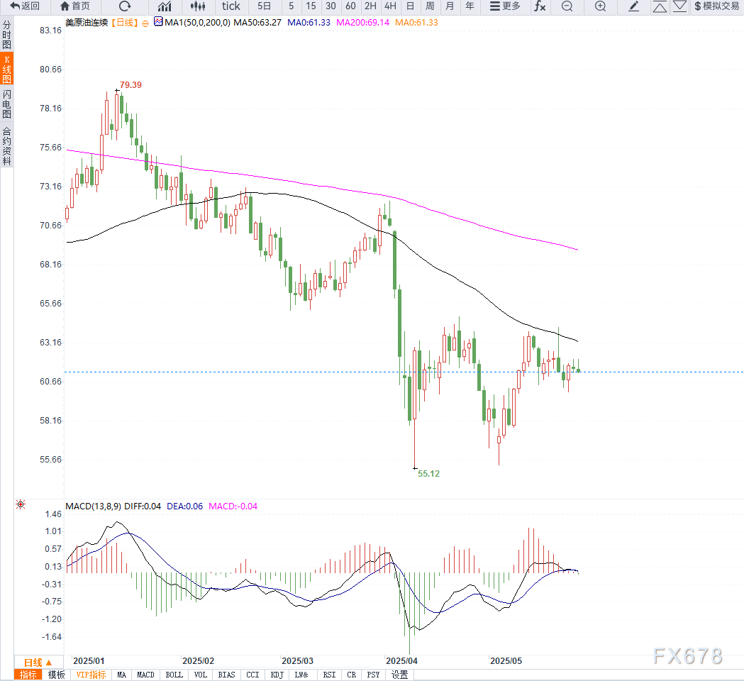 从日线图来看,美国西德克萨斯中质原油(WTI)近期呈现高位震荡回落态势。价格连续多日在62美元上方遇阻,显示上方压力较重,短期均线呈现死叉迹象,动能指标如MACD死叉运行,暗示短期走势偏弱。