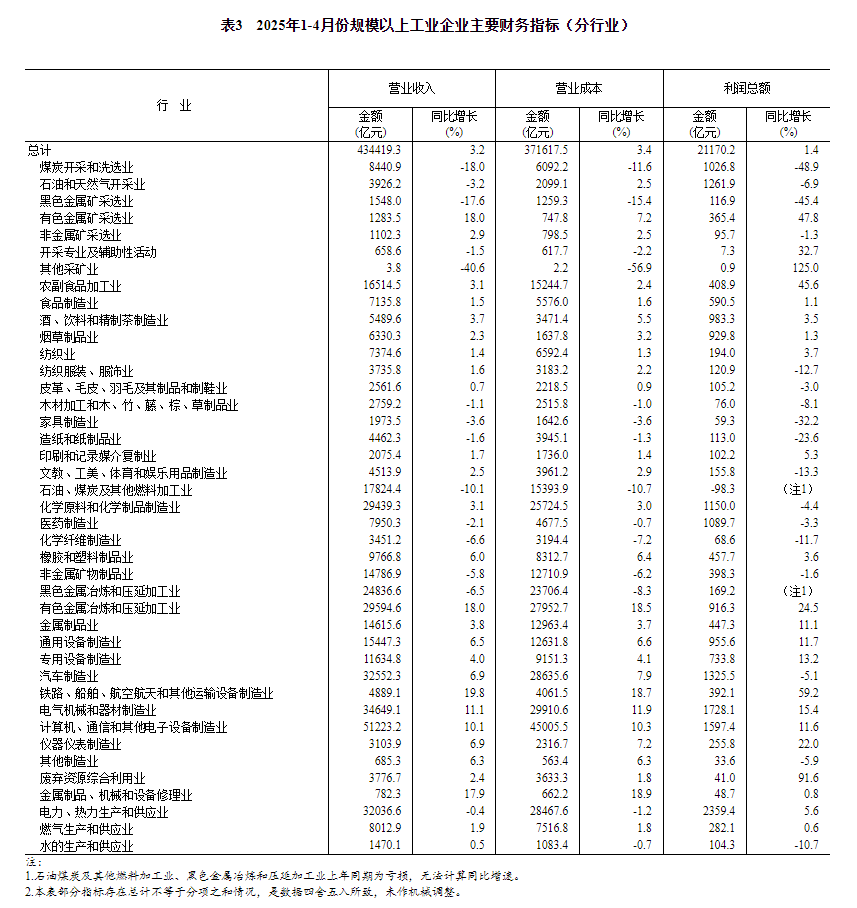 1—4月份,主要行业利润情况如下:农副食品加工业利润同比增长45.6%,有色金属冶炼和压延加工业增长24.5%,电气机械和器材制造业增长15.4%,专用设备制造业增长13.2%,通用设备制造业增长11.7%,计算机、通信和其他电子设备制造业增长11.6%,电力、热力生产和供应业增长5.6%,纺织业增长3.7%,非金属矿物制品业下降1.6%,化学原料和化学制品制造业下降4.4%,汽车制造业下降5.1%,石油和天然气开采业下降6.9%,煤炭开采和洗选业下降48.9%,石油煤炭及其他燃料加工业同比增亏,黑色金属冶炼和压延加工业同比由亏转盈。