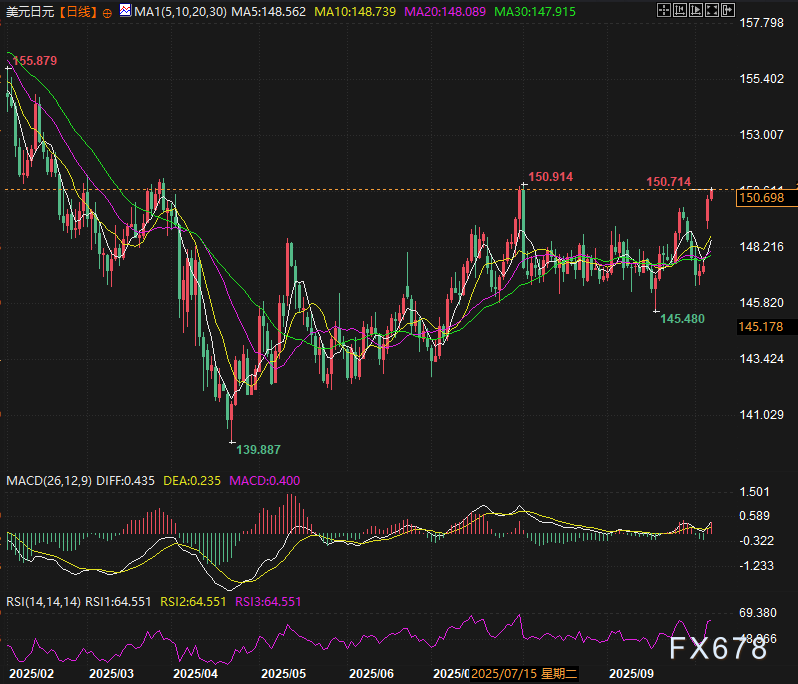 (美元兑日元日线图) 北京时间16:39,美元兑日元现报150.73/74。