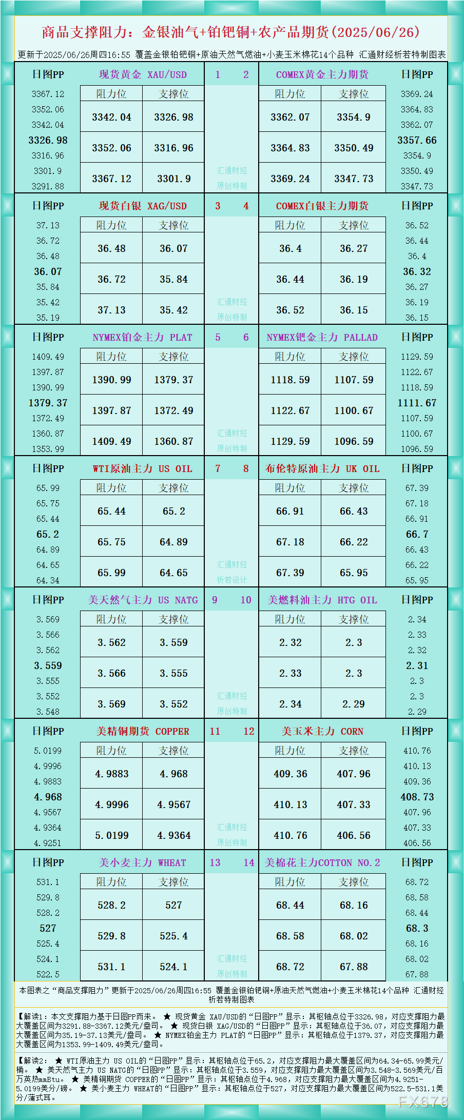 XM外汇官网一张图看商品支撑阻力:金银油气+铂钯铜农产品期货(2025年6月26